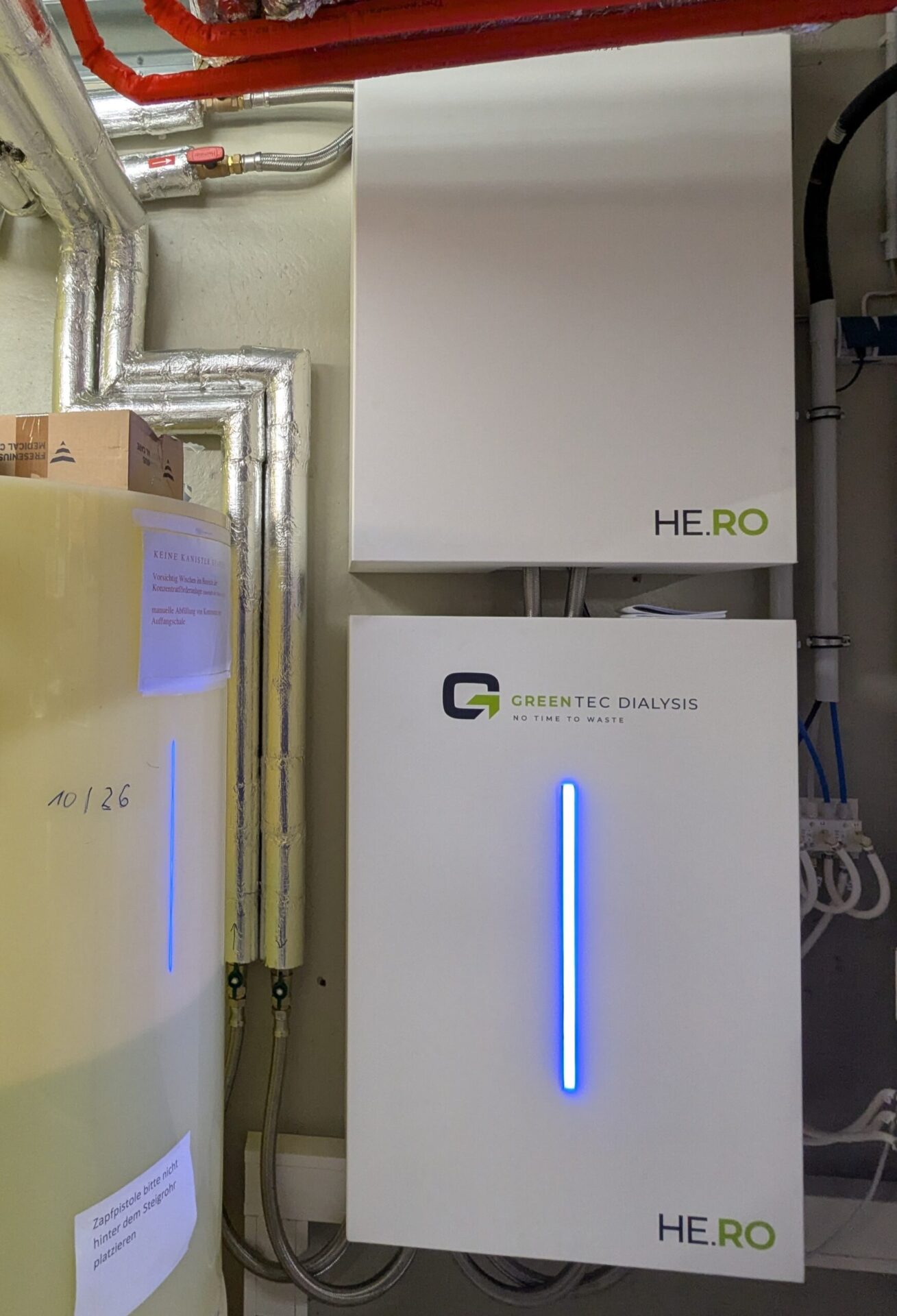 Dazu haben wir unser Smart Dialysis-Konzept bestehend aus Sektorenvernetzung umgesetzt, hier mit unserem HE.RO und Wärmepumpe, sowie unser GPS als Monitoringssoftware installiert. Eine doppelstufige Umkehrosmose von B.Braun und die bestehende PV-Anlage haben wir in unser System integriert.