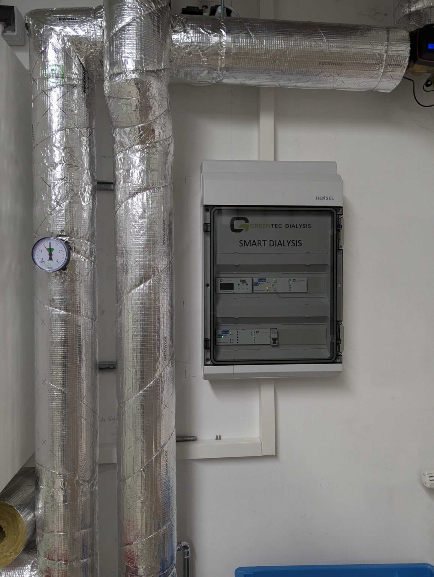 Umgesetzt haben wir unser Smart Dialysis®-Konzept bestehend aus Sektorenvernetzung mit unserem HE.RO-Wärmetauscher in Kombination mit zwei Wärmepumpen und Anschluss an die bestehende PV-Anlage. Als Pilot haben wir eine Wärmerückgewinnung an den Konzentratabfluss der Osmoseanlage angeschlossen, um noch mehr Energie sparen zu können. Das abgekühlte Wasser wird dann für die Toilettenspülung verwendet. Unser GreenTec Performance System (GPS) haben wir als Steuerungs- und Monitoringssoftware installiert.