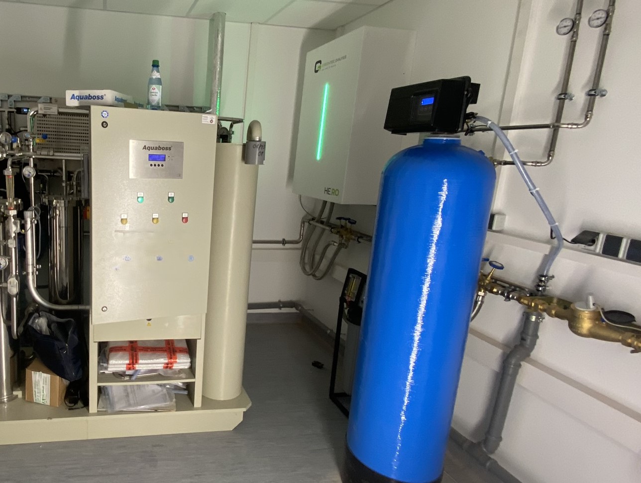 In Ergänzung haben wir eine doppelstufige Umkehrosmose von B.Braun in Verbindung mit einer hygienischen Heißreinigung und der orbital-geschweißten Permeatringleitung (V4A) installiert sowie in unser System integriert.