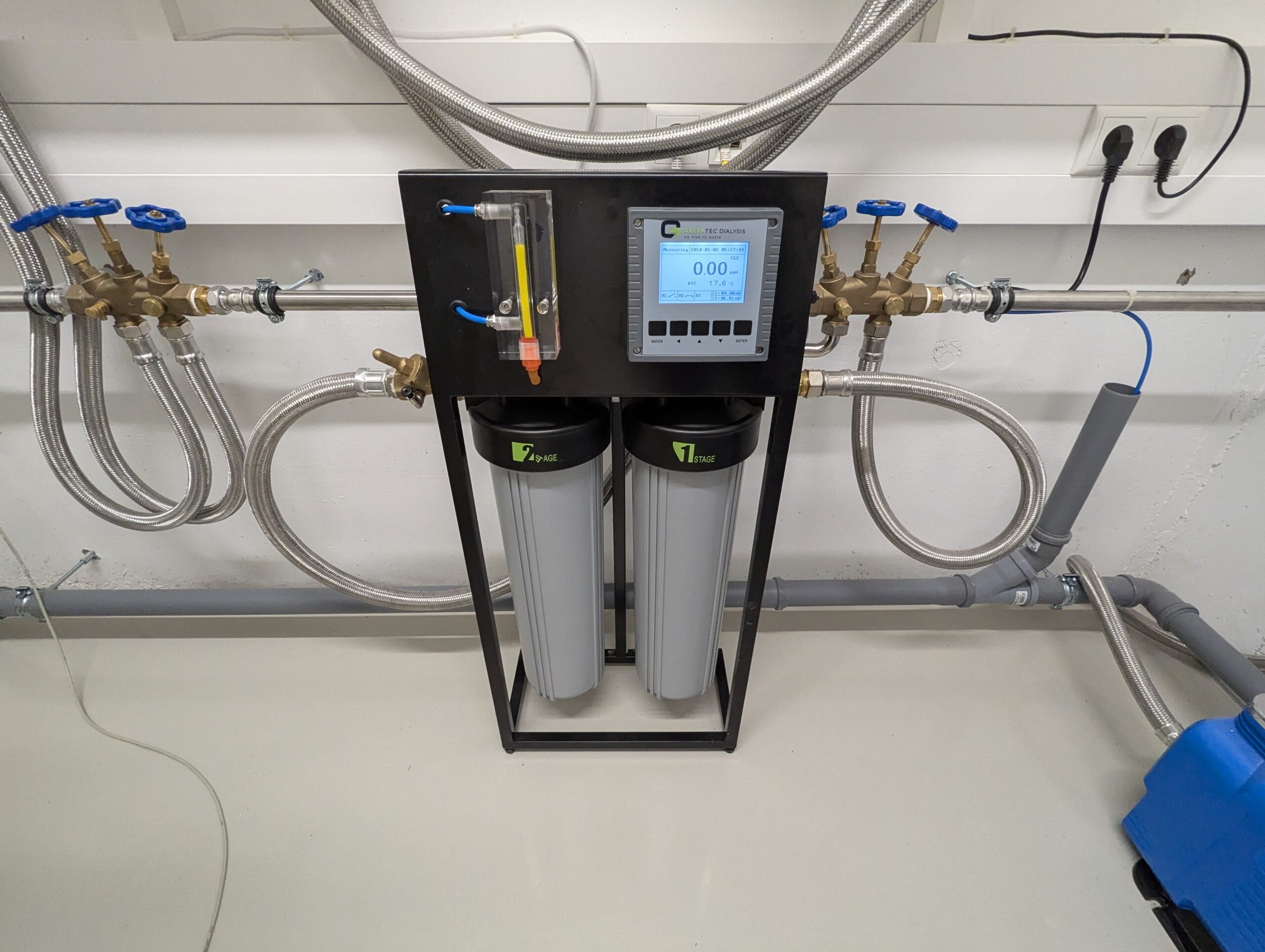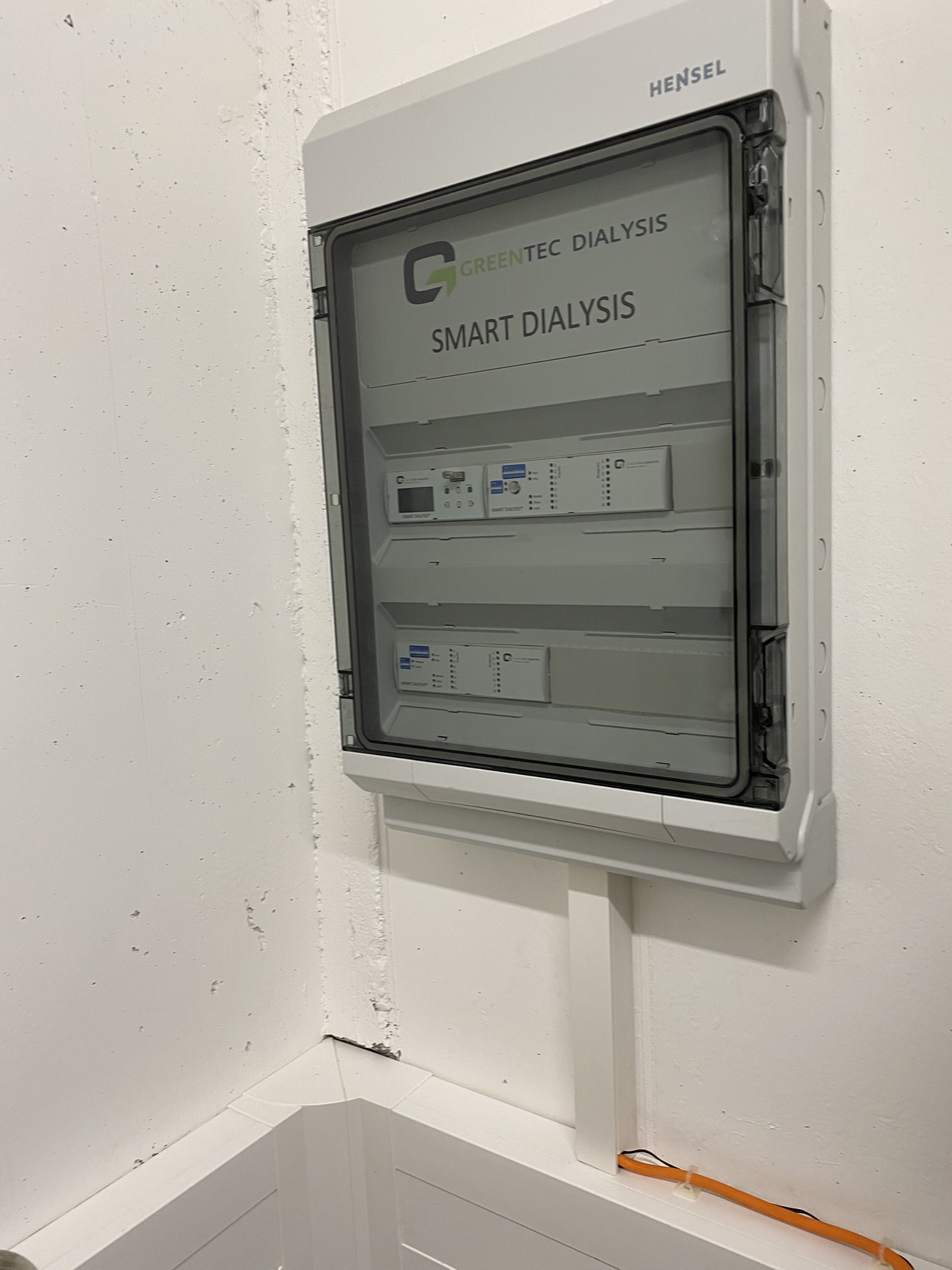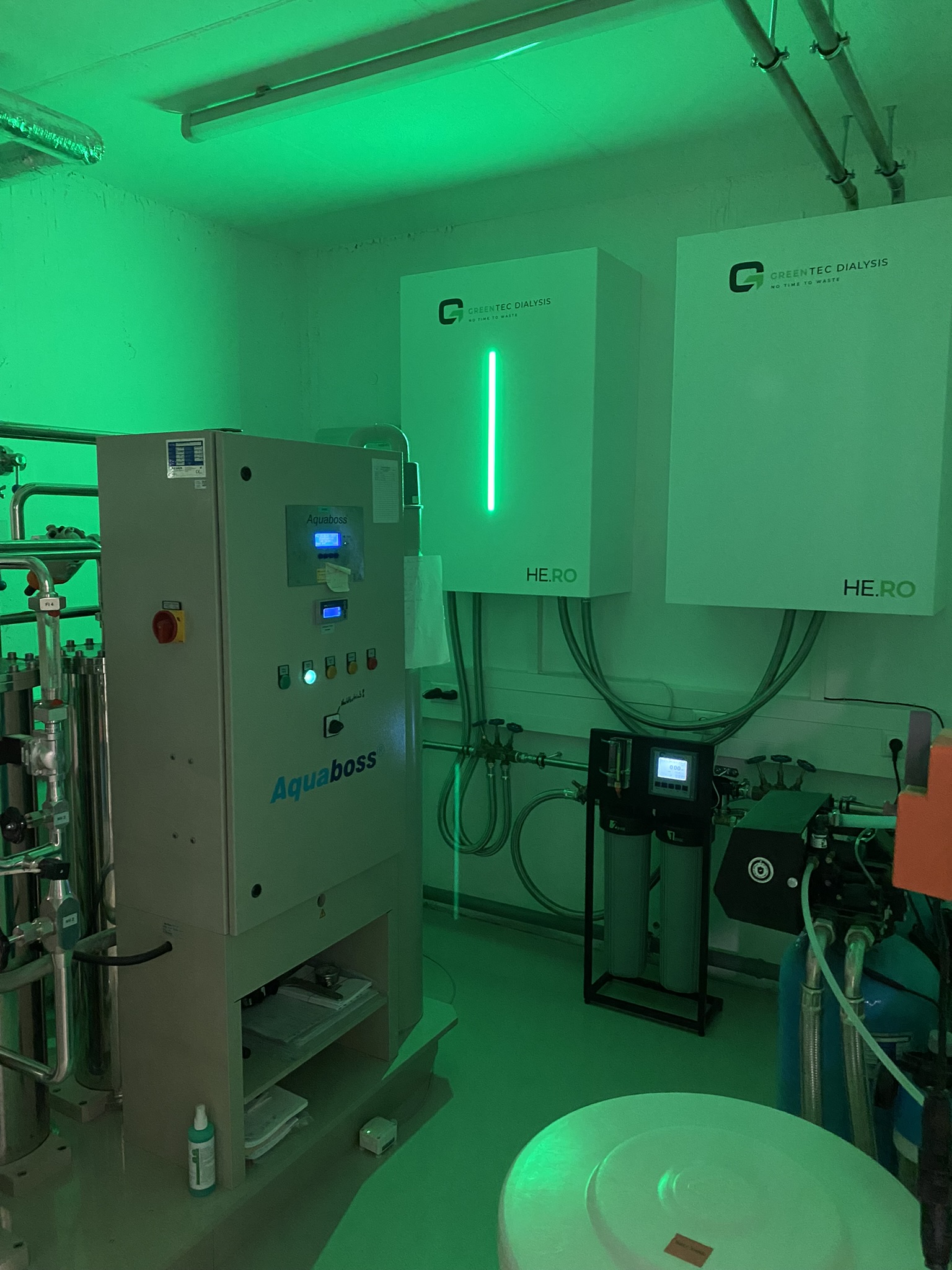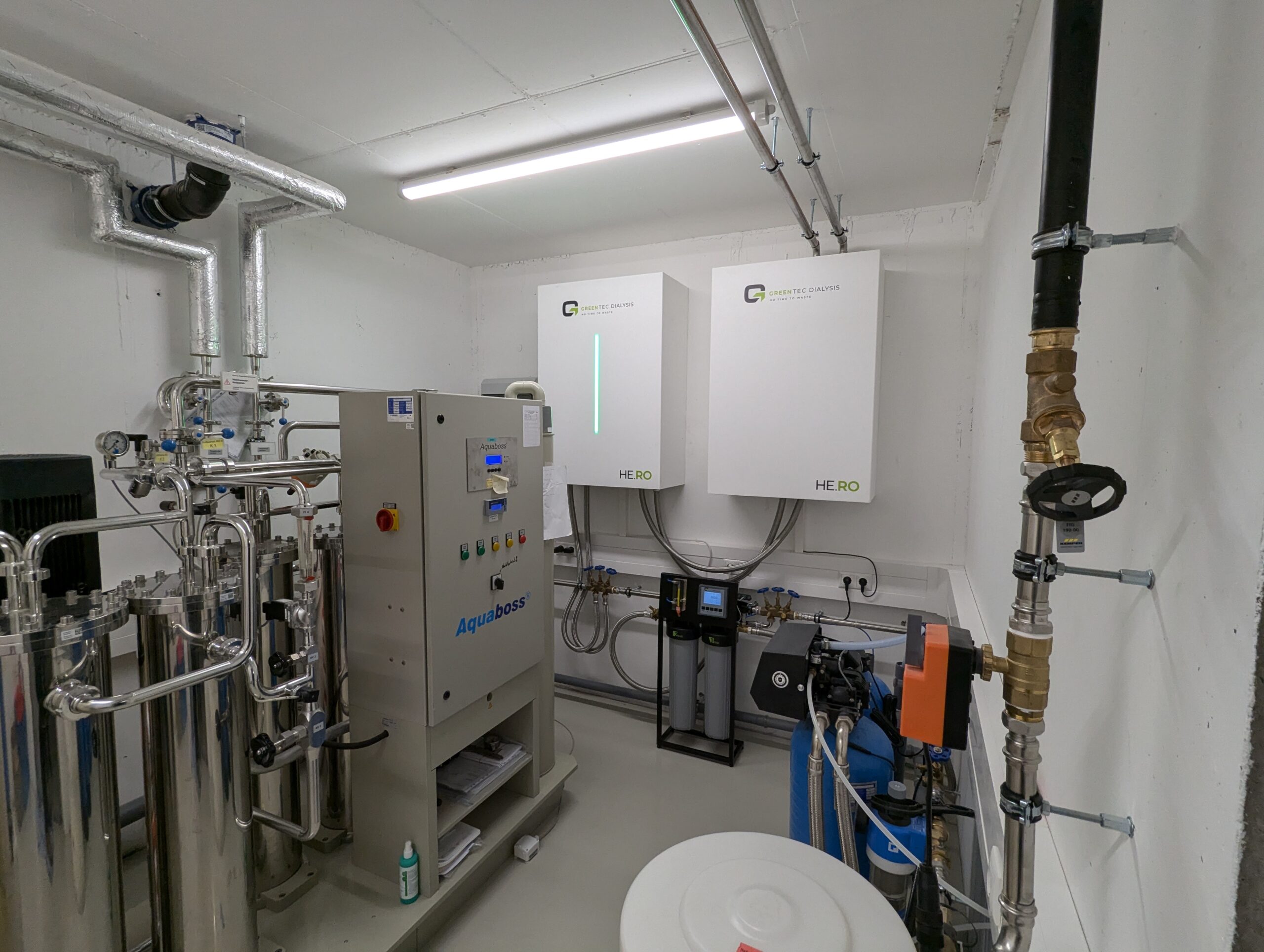 Um die ökonomischen und ökologischen Aspekte auch in der Wasseraufbereitung optimal umzusetzen, haben wir unser Smart Dialysis-Konzept installiert. Es beinhaltet unsere Sektorenvernetzung, hier mit unserem HE.RO und Anschluss an die zentrale Wärmepumpe (zentrale Heizungsanlage) des Gebäudes, sowie unser GPS als Steuerungs- und Monitoringssoftware. Die Bestandsosmose wurde umgezogen, neue Permeat- und Konzentratringleitungen haben wir installiert.